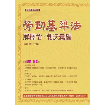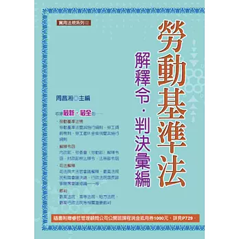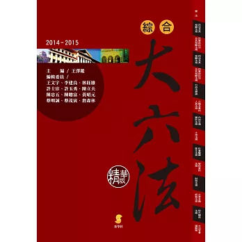 詳細資料ISBN:9789862557082 叢書系列:法規工具書 規格:平裝 / 1712頁 / 13 X 19 CM / 普通級/ 單色印刷 / 二十版 出版地:台灣 內容簡介凡 例 一、本書收錄之法規 (一)本書適合一般社會大眾、研習法律者,特別是法律系學生及法律從業人員使用,收錄重要且常用之法規共八十二種,依性質區分為憲法、行政法、民法、民事訴訟法、商事法、刑法、刑事訴訟法、法律倫理等八大類。 (二)本書收錄至105年2月最新之法規,如下: •105.01.06修正公布之《政府採購法》 •105.01.06修正公布之《強制汽車責任保險》 •104.12.31修正公布之《消費者保護法施行細則》 •104.12.30修正公布之《行政程序法》 •104.12.30修正公布之《家事事件法》 •104.12.30修正公布之《中華民國刑法》 •104.12.30修正公布之《中華民國刑法施行法》 •104.12.30修正公布之《促進民間參與公共建設法》 •104.12.30修正公布之《個人資料保護法》 •104.12.23修正公布之《公務人員保障法》 •104.12.16修正公布之《勞動基準法》 •104.12.16修正公布之《兒童及少年福利與權益保障法》 •104.12.09修正公布之《金融機構合併法》 •104.12.02修正公布之《仲裁法》 •104.09.30修正公布之《金融控股公司法》 •104.07.08修正公布之《企業併購法》 (三)書末附有司法院大法官解釋彙編至第734號與大法官釋字索引表。 二、本書體例 (一)法規分類 目錄中分類法規前,以「憲法類」、「行政法類」、「民法類」……標示法規分類,並於內文中以出血設計,以便讀者直接翻閱查詢。 (二)沿革 立法及歷次修法沿革,附列於法規名稱之後、條文之前,使讀者瞭解各法規之演變。 (三)條號 為便利讀者易於閱讀,法條條號如「第一百六十八條」以「第168條」表示;「第一千三百六十六條之一」以「第1366條之1」表示。 (四)條文要旨 在各法條條號後,標明條文要旨,如「第1條(不溯及既往原 (五)項次 法規條文有二項以上之規定時,在各項條文前分別以「Ⅰ、Ⅱ、Ⅲ……」等符號標明項次,便利讀者查詢、辨識。 (六)司法院大法官釋字 將解釋文中之重點,以不同字體標示,供讀者迅速掌握解釋文要點,並於書末附有大法官釋字索引表,將各號解釋文以法領域分類,並羅列其解釋要旨與相關法條,便利讀者閱讀、掌握法規相關之解釋文重點。 |